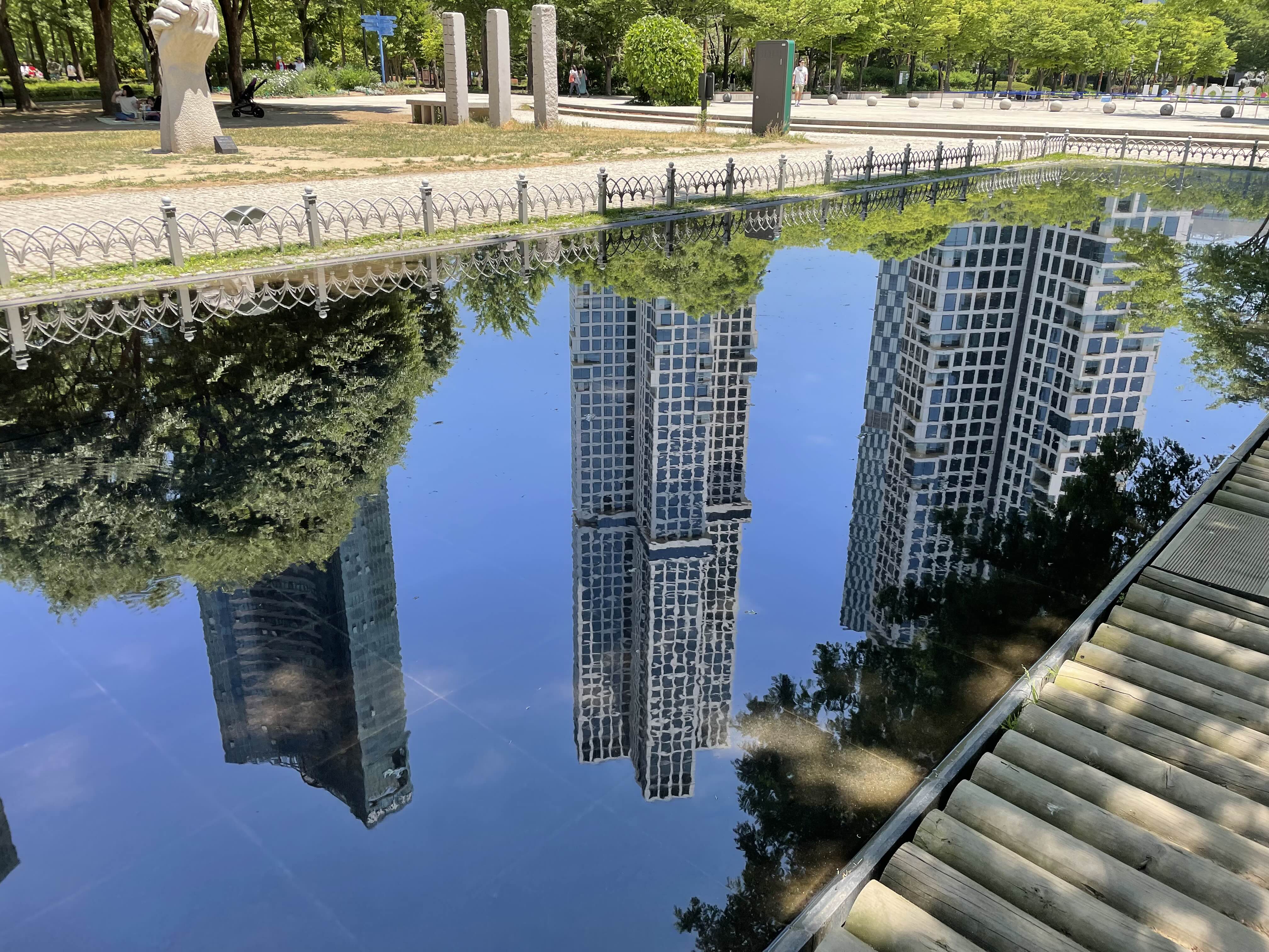3번 출구 쪽에서 들어가면 가장 먼저 보이는 것은 거울연못인데요, 깊은 연못은 아니고 타일 위에 물을 아주 얕게 깔아놓아서, 하늘이 반사되는 구조입니다. 정말 예뼈서 한참 연못 주변을 돌며 사진을 찍었어요.