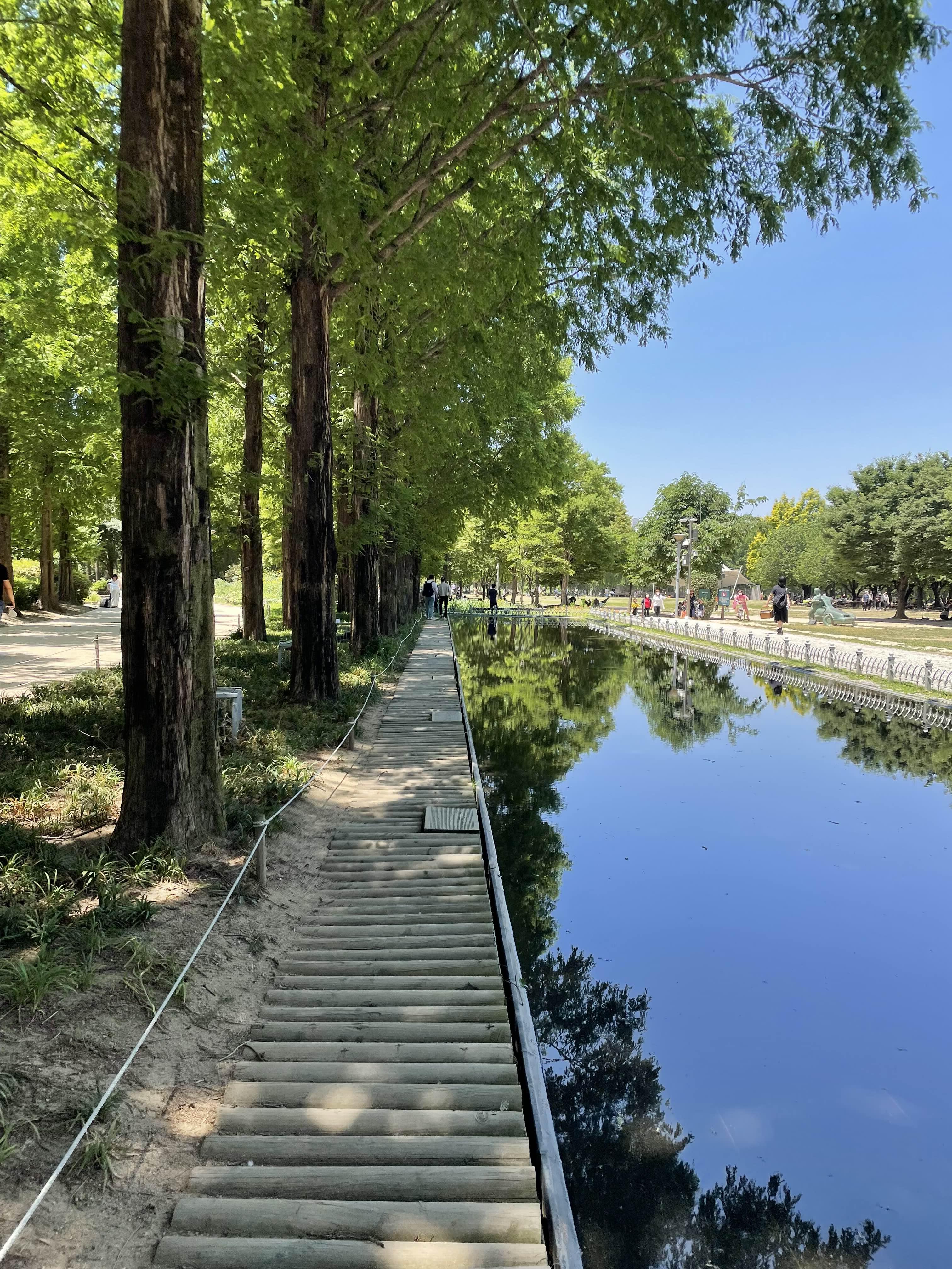 나무 심은 곳 사이사이를 걸어 다닐 수도 있고, 아담한 나무 다리도 있고요. 다리 밑으로는 작게 냇가도 있어서 하늘을 비추는데 정말 반짝였어요.